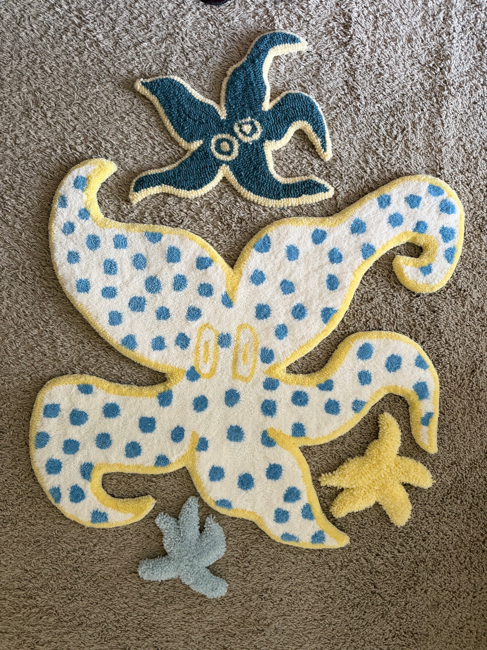 Hand made to order, each of these nautical sea stars in the collection are sure to bring whimsy to your home. For use as a rug, wall accessory, or available to frame.