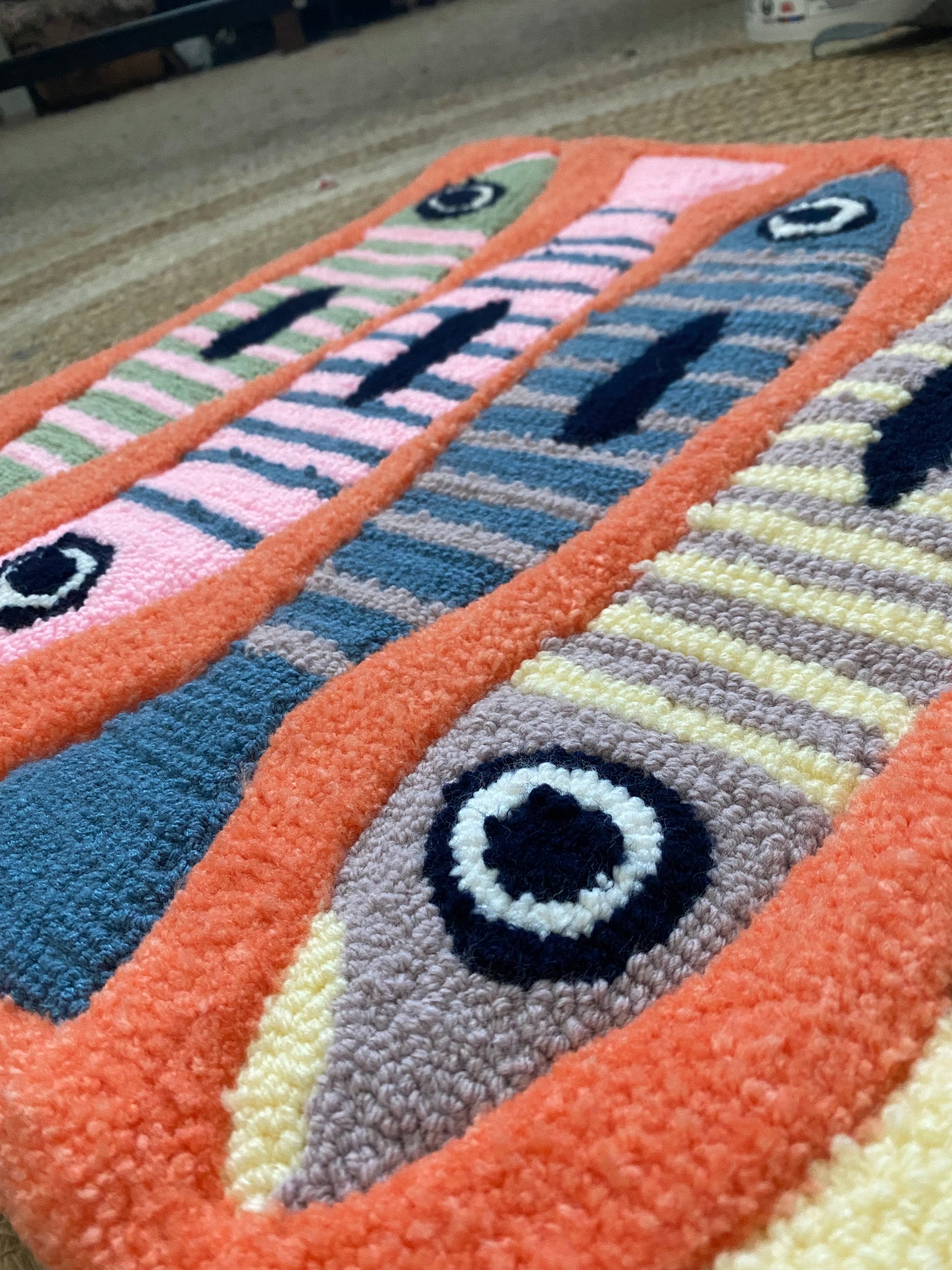 Dive into vibrant style with this funky fish rug! Hand-made with intricate detail and bursting with bright colors, this playful piece features a non-slip backing for secure placement. Perfect for adding a splash of fun to any room!
